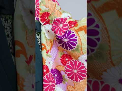 優しいペールグリーンに、はっきりとした配色で表現された菊花文様が、今までにない個性的な着姿を演出してくれます。