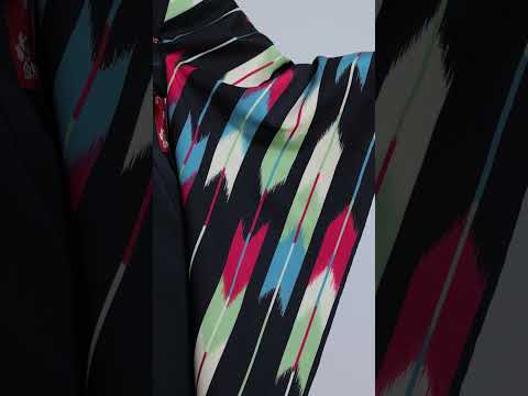 カラフルで、大胆に描かれた大矢絣の珍しさが印象的。漆黒の地に映えて、鮮やかな矢絣が一層煌めきます。矢絣のレトロさを残しつつ華やかさを取り入れた、異なる趣を愉しむことができる一枚です。