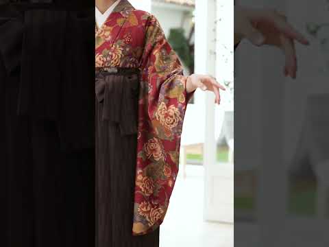 シックな赤色の生地に、大きく描かれた菊と扇面模様が優美な一着。扇面模様には有職文様の七宝が描かれており、着物をより格調高いものにしています。